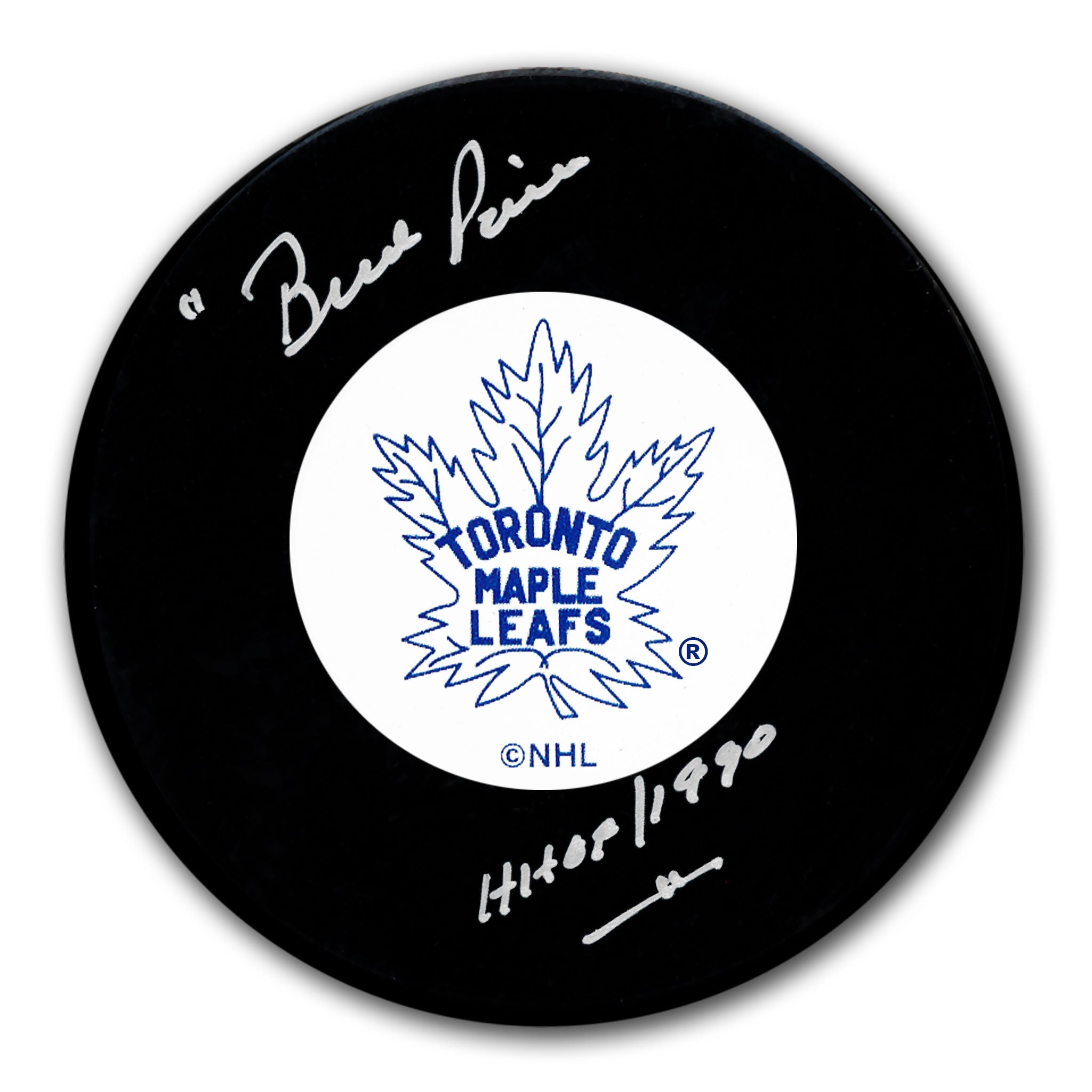 This is a Bud Poile Toronto Maple Leafs HOF Original 6 Autographed Puck.