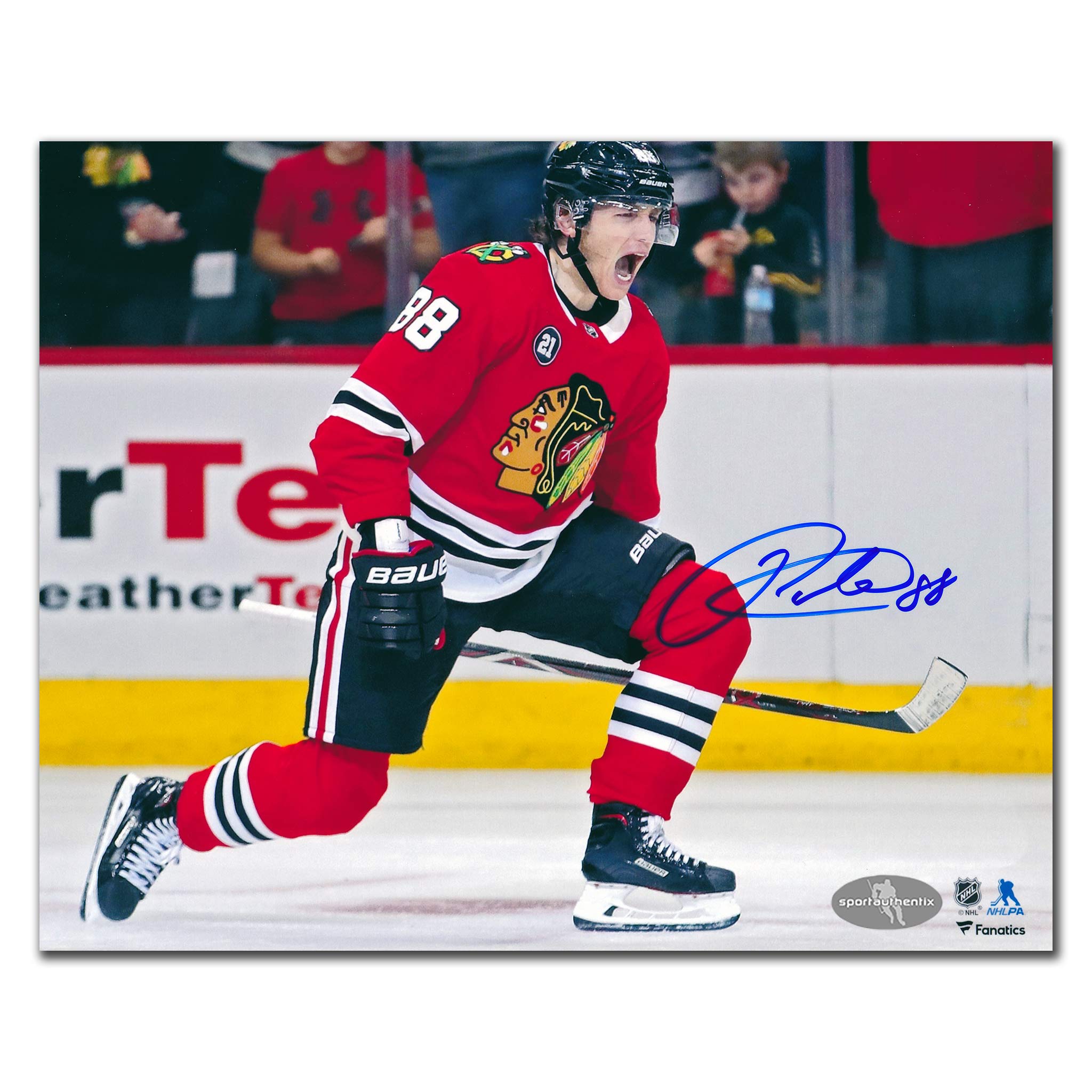 This 8x10 photo is hand signed by Patrick Kane.